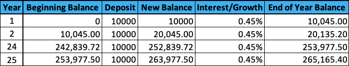 Example 1 shows us the growth over 25 years at a 0.45% interest rate, which is the average rate for most savings accounts today. In this case, if you were to deposit $10,000 each year for 25 years, and your interest would be compounded yearly, you would end with $265,165.40. That is $15,165.40 of interest earned over 25 years.