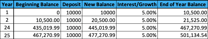 Example 1 is the same example as above, earning 5% interest compounded annually, with $10,000 deposits. For this example, you end with over half of a million dollars, while only contributing $250,000.