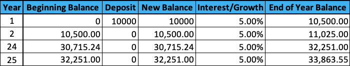 For this example, you put in $10,000 in year one, but do not add any more deposits. You will earn a hefty $23,863.55 in interest, but ultimately, you only end with $32,251.00 over 25 years.