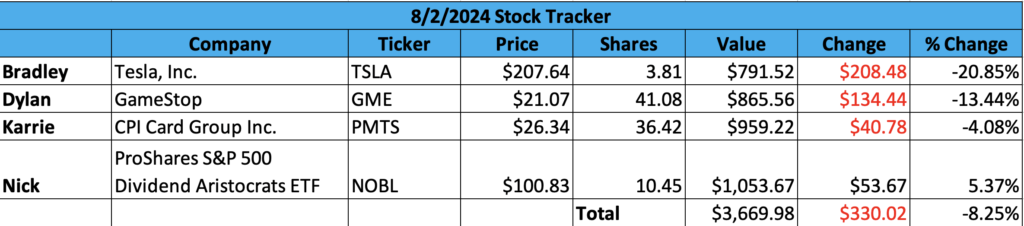 Our fund has dropped just over $330, with most of those losses stacking up after poor performance in the market this week. Tesla is in a deep slide, GameStop lost about $125 (13%) in one week, while PMTS dropped almost $150 in just 5 days! The stock market and S&P 500 struggled, but NOBL, a S&P 500 ETF, increased just slightly at 0.28%