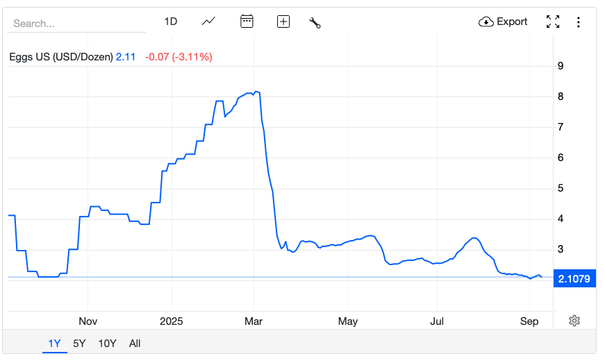 Egg prices According to Trading Economics spiked in early 2025 due to avian flu outbreak