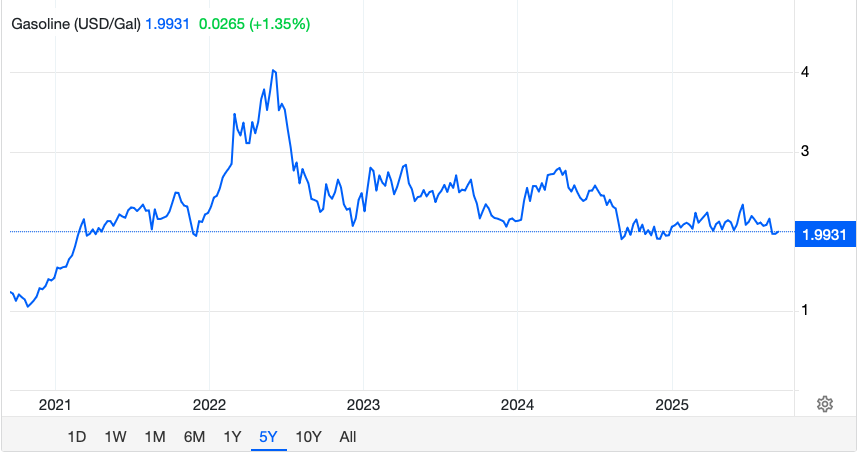 Since late 2024, gas prices have been settling quite well, with consumers paying on average around $3.193/gallon according to AAA. Prices a year ago were not too much higher, around $3.27/gallon.
