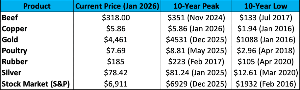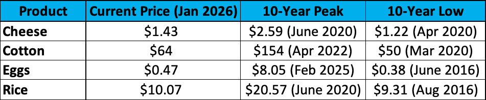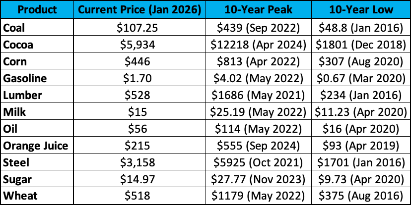 This category are the products that have high prices today, well above their 10-year average. They may not be priced above their 10-year peak, but they are still high, and there are not necessarily good signs of the prices coming down.